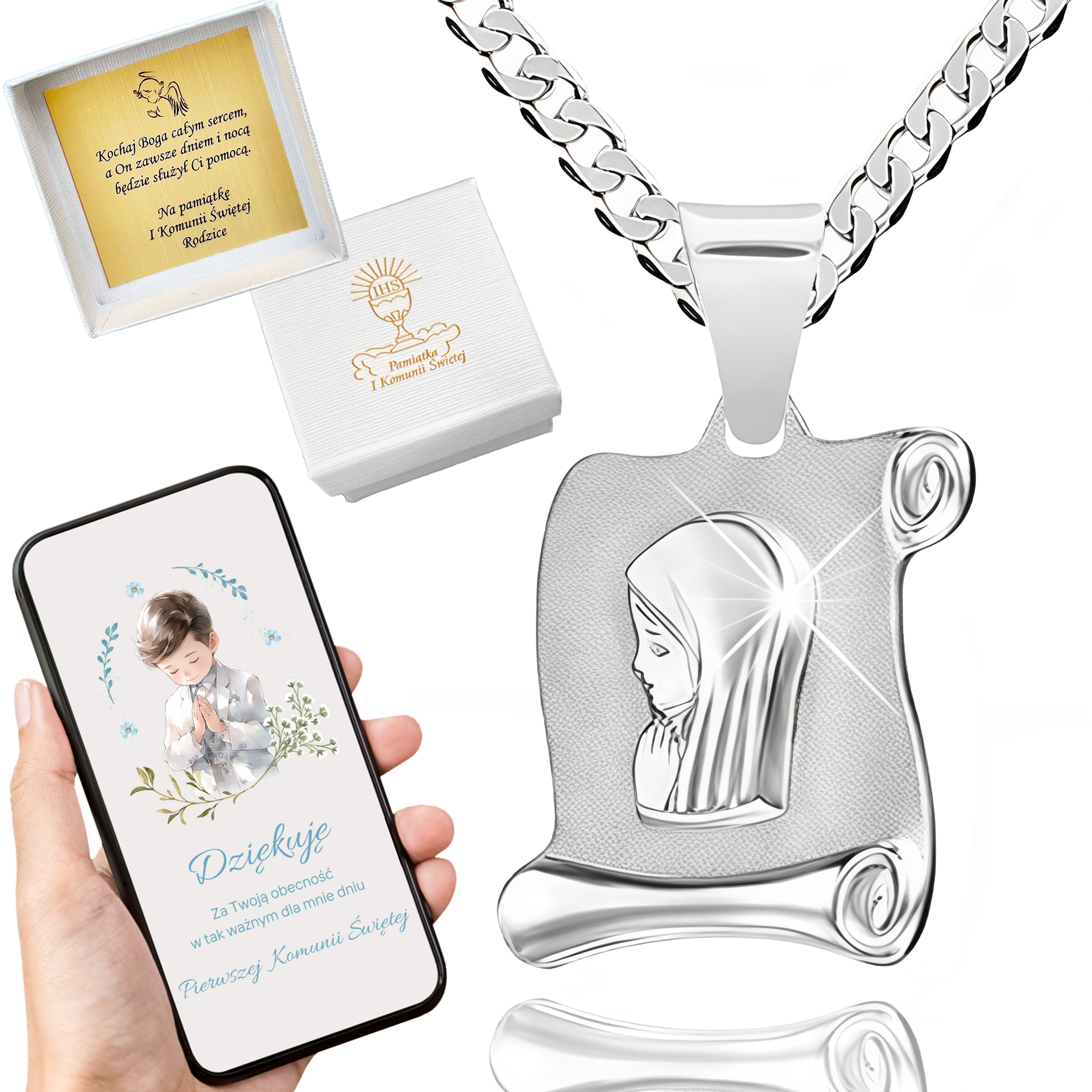 SREBRNY ŁAŃCUSZEK KOMUNIJNY I MEDALIK SREBRO 925